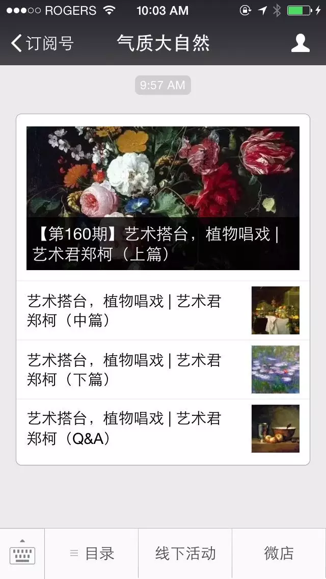 还记得艺术君之前在微信群“气质大自然宇宙委员会”做的那次分享吗?主题是《艺术搭台,植物唱戏——论西方艺术中植物的主配角转换》 。分享的内容艺术君也分成多次转发过。现在,这个微信群对应的公众号【气质大自然】(qznature)已经将全部内容整理成一条多图文啦,如下图: