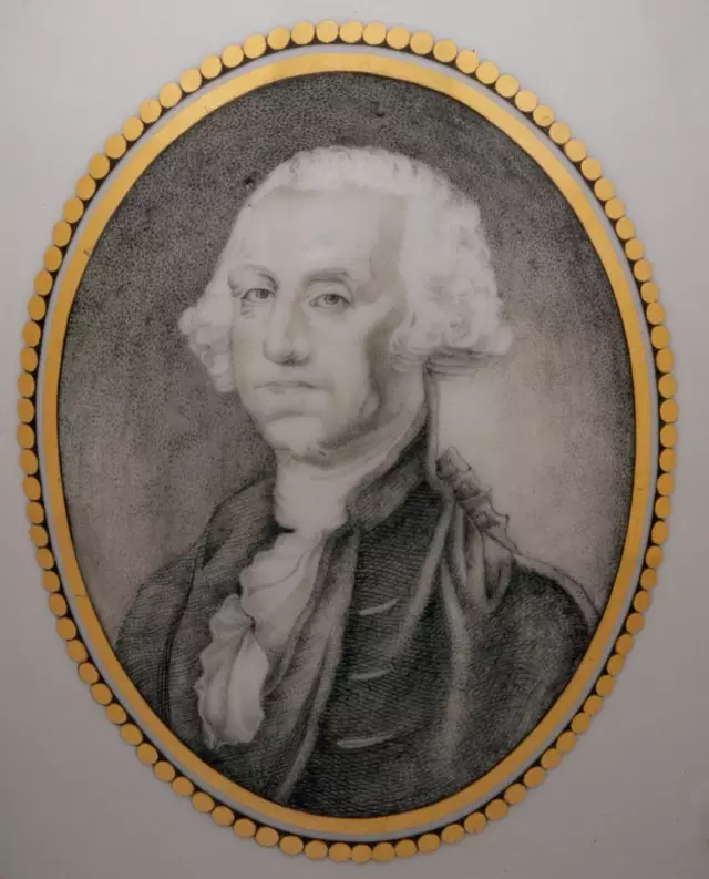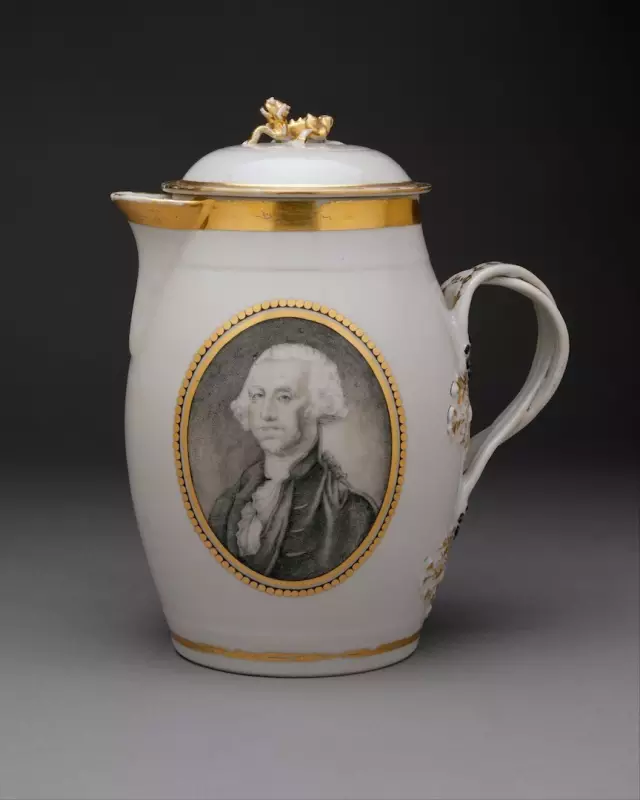 壶嘴下方的ET金字,是Edward Tilghman的缩写,他是费城当时有名的律师。该壶本有一对,是Tilghman的叔叔Benjamin Chew Wilcocks赠给他的,Wilcocks在广东经商。他本来定制了四件这样的壶,上面有类似的乔治·华盛顿灰色装饰画。除了给Tilghman的这一对,他还有一件上面有自己的缩写:BCW,第四件上面的缩写是CI,估计是他的朋友 Charles Ingersoll。这幅华盛顿的肖像,忠实复制了David Edwin(1776-1841)的雕刻版画,后者当时就在费城工作。