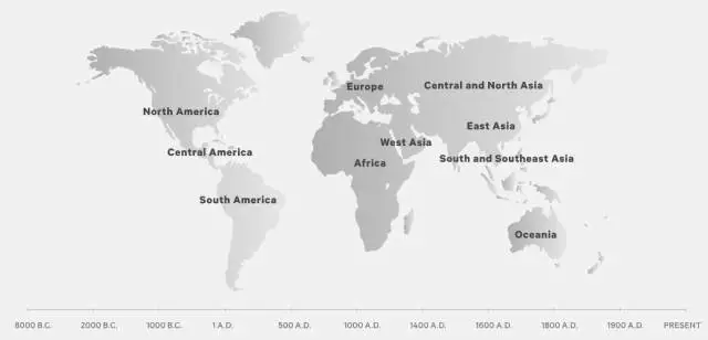 年代:按照地理位置提供线性的艺术史时间分期。每个年代包括十件代表性的艺术作品、一条时间线、一个总体介绍,以及关键事件。