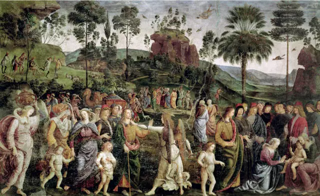 两个场景之间,常常存在某种联系。比如《发现摩西》和《基督诞生》,二者都曾装饰圣坛墙面,其共同元素是:奇迹般地降临或是发现某个婴儿,这婴儿是神圣的,或者可以带来拯救。这两幅湿壁画毁于一五三六年,都是彼得罗·佩鲁吉诺的作品,他也负责圣坛画《圣母升天》。幸运的是,两侧墙面最初的作品《基督受洗》幸存下来,让人们可以见证佩鲁吉诺的绝佳技艺。