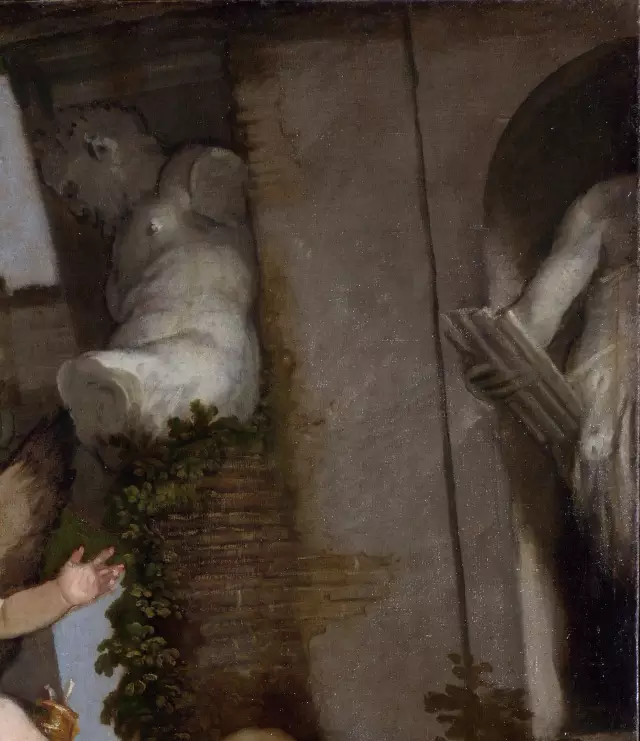 画家能够有意识地把一个形状扩展到什么程度,总是很难搞清楚,就像很难知道音乐家如何将一段单一的旋律扩展到一整个乐章。绘画艺术的重点不在大脑,常常是手在起作用,强迫符合某个特定节奏,而不需要智识上有所意识。想到这些,我回忆起提香最值得信赖的学生帕尔玛·乔瓦尼(Palma Giovane)描述提香如何工作:他先粗略勾画出大致构图,再将画布固定在墙上;接下来,当创作欲望来临时,他就再次以同样的自由向作品发起进攻,然后又放在一边。因此,充满激情的渴望、还有第一笔画出时本能的节奏,他可以一直维持住。到最后,帕尔玛告诉我们,提香会更多地用手指而不是画笔作画。在《基督下葬》中我们已经可以看到(早已在帕尔玛时期之前完成),有些局部,比如尼哥底母披风的衬里,提香可以借助画笔的运动直接与我们交流。