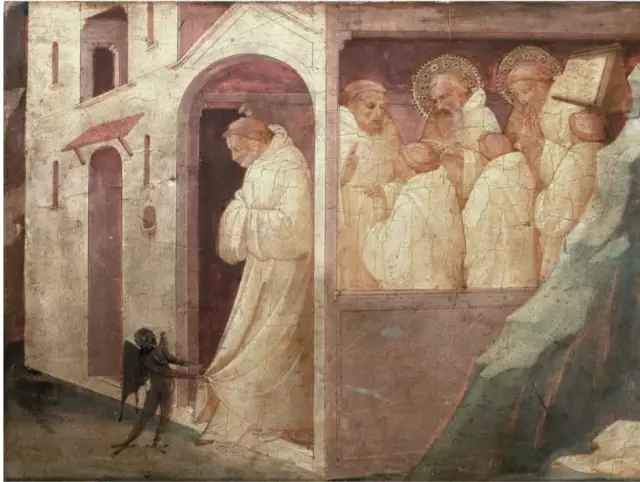这幅小而狭长的长方形木板油画中,描绘了圣本笃生平的两个场景,他是本笃会的创始人。画面左边,可以看到圣本笃在阻挠一个恶魔,后者想要诱惑一个僧侣。在《黄金传说》中,本尼迪克特曾提到:恶魔化身为一个黑皮肤小童,揪着僧侣的衣服下摆,将他拉出房间。