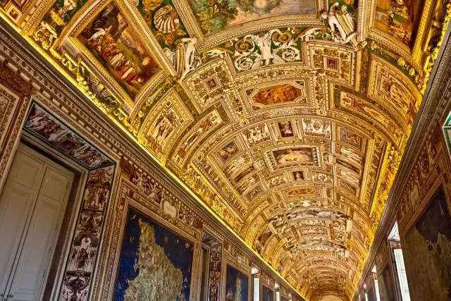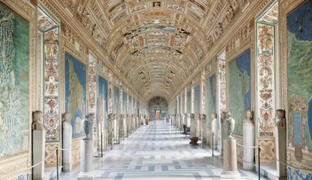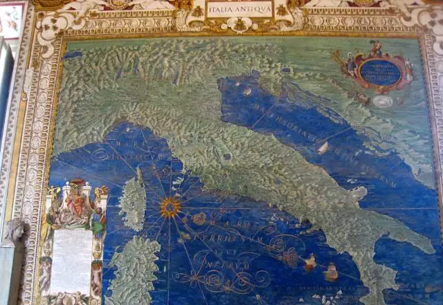 地图长廊延伸一百二十米,拥有有史以来规模最大的手绘地图系列收藏。这里也是世界最古老的长廊之一,两侧的窗户之间,各包含十六块宽阔的墙面,长墙四个尽头处和每面短墙上还有狭窄空间。格列高利十三世一共委托了四十幅地图,它们在一五八零到一五八一短短一年间就完成了。这些地图描绘了意大利的不同省份,以及属于教皇国的领土。