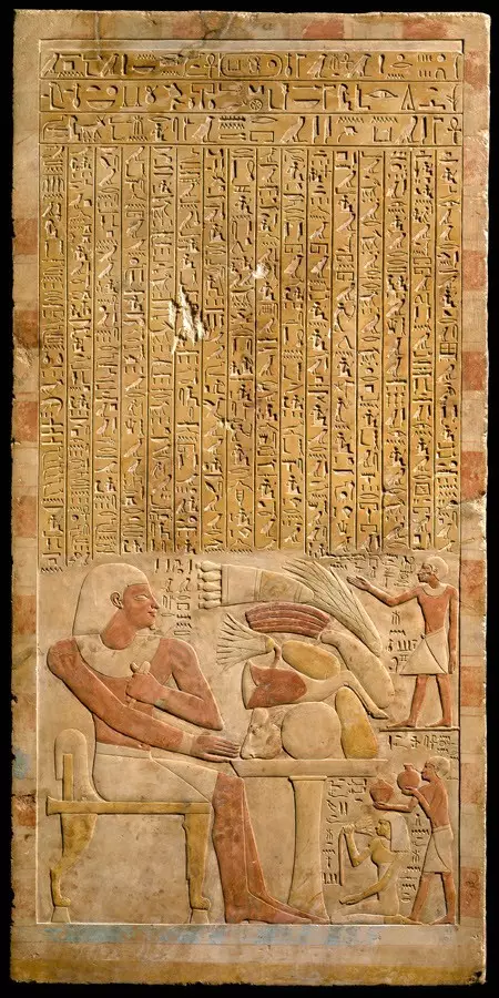 “这是古埃及的陶工首领碑,创作于公元前18世纪。上面是古埃及的象形文字,记录了一个陶工的工作情况。他侧着身子坐在那里,右手下面放着各种陶坯。……”
