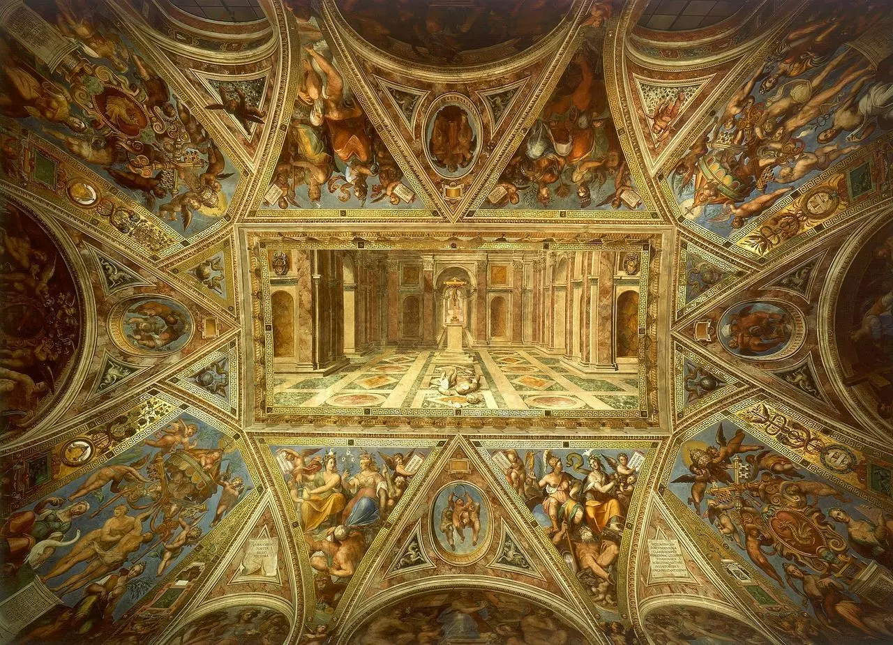 房中场景按照时间顺序安排,第一幅在窄墙上,是《十字架的幻象》。其中刻画了君士坦丁的幻象,这幻象帮助他战胜了反抗他的异教皇帝马克森提乌斯。