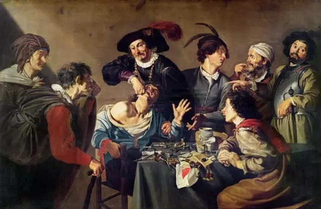 题图是佛兰德斯画家西奥多·罗姆鲍茨(Theodoor Rombouts)的《拔牙者》,转过来看得更清楚。