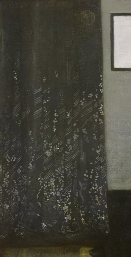 虽然跟画框同色,但窗帘却比画框不知道宽了多少。如果只是这么垂下来,它一定是无趣的。极其钟爱日本浮世绘的惠斯勒,为窗帘下半部点缀上了日本和服样式的花纹:白色、黄色、灰色的樱花,加上斜斜的条纹,一下就调动起生机无限,这种生机又跟整个画面占据主导地位的相对低沉、平静的氛围形成对比。