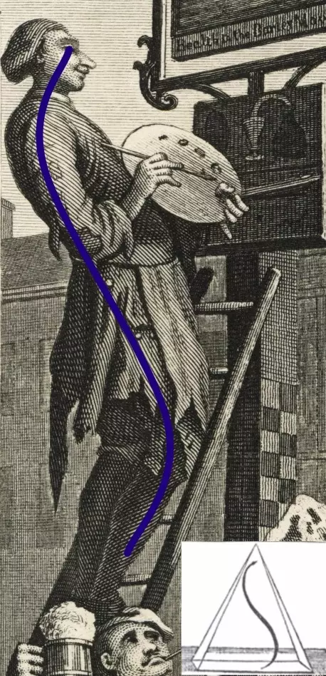 “还有哪些运动决定了 S 的线条?长久以来,艺术家一直认识到它的美学功效。伟大的英国画家贺加斯在著作《美的分析》中,甚至赞美它有最完美的线条,称其为‘美之线条’。他书中由他完成的蚀刻作品里,展现出多个类似例子,用其表现人的身体、花朵的形状、衣裙愉悦的坠线,或者是一片家具的轮廓。”(法国作家雷尼·于热[René Huygue]《图像的力量[La puissance de l’image]》)
