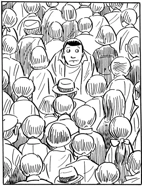 基尔希纳的《波茨坦广场》中,虽然有十来个人,但是他们彼此之间似乎完全隔膜,没有任何互动,即便是小小安全岛上的两个女人,两双高跟鞋似乎绞在一起,主人却丝毫没有眼神、语言和动作的交流。 在日本“剧画”祖师爷辰巳嘉裕(日语:辰巳 ヨシヒロ,英语:Yoshihiro Tatsumi,1935年6月10日-2015年3月7日)的作品中,同样可以看到类似场景,他喜欢描绘主角在攘攘人流中行进时的情形,构成人流的个体,每一个与其他人都没什么关系,同样是彼此淡漠、忽视,毫不关心,下面是典型的一张截图: