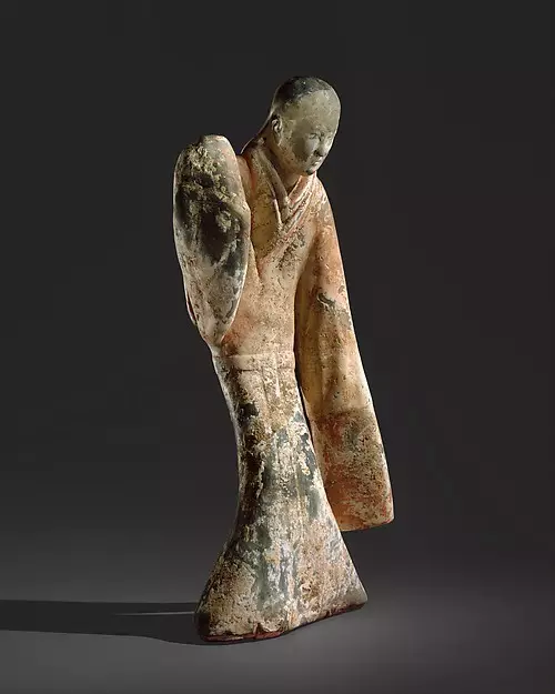 该陶俑为中国早期雕塑精品,艺术家将运动感表现在静态的形体之中。女舞者一只衣袖后甩,一只垂下欲扬。她附身向前,双膝弯曲,抬起脚跟。让人想起傅毅所著《舞赋》中的词句: