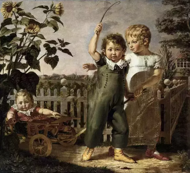 画中有三个孩子,最右边的是大姐玛丽,二弟奥古斯都在中间,左边婴儿车里是最小的弗里德里希。最大的玛丽也就四五岁的样子,弗里德里希的婴儿车有个手柄,拖在她和奥古斯都的手里。虽然年纪不大,玛丽表现出一个大姐姐应有的责任心,眼睛望着最小的弟弟,同时伸出右手,似乎想要吸引他的注意,同时又像是在庇护奥古斯都。身着蕾丝和类似工装裤的二弟,跟所有这个年纪的男孩子一样,喜欢打打杀杀,左手挥舞着鞭子,这架势让人想起艺术君小时候常玩儿的“骑马打仗”。整个画面的视线也和他的双眼齐平。胖嘟嘟的弗里德里希和小哥哥一样,都看着画面外的观者,那眼神中有天真,但又有某种凌厉。不知道这会不会让你想起来:不知道为什么,有时候,你不敢跟弗里德里希这个年纪的小孩儿对视太久,似乎你才是没穿衣服的那一个,他已经看穿了你的一切。
